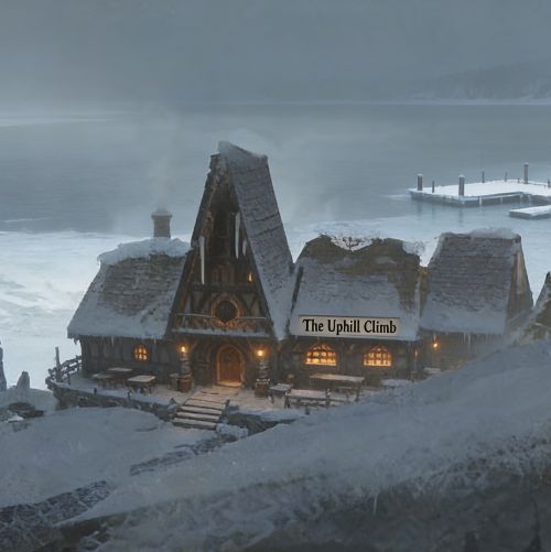 The common room is quieter than most. A few locals sit with bowls of chowder and tired shoulders, speaking only when they must. Firelight pushes back the cold in soft, uneven waves. Outside, the wind still moves along the lake and under the eaves.