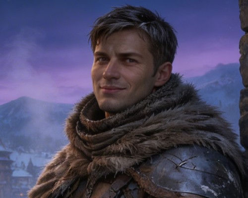 They’re not ceremonial. Not polished. Their armor is practical, layered beneath heavy cloaks crusted with frost. One is older, beard shot through with gray, posture steady as the stone behind him. The other is younger, eyes sharp and restless, the kind that measure trouble and opportunity in the same glance.
